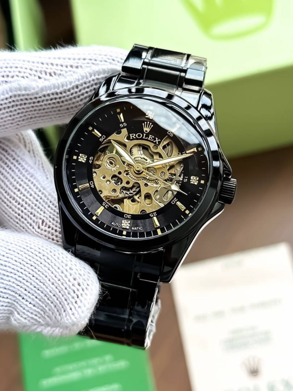 Discover unparalleled sophistication with the Black Skeleton Automatic Watch with Gold Accents, designed to elevate your style effortlessly. This exquisite timepiece is inspired by timeless Rolex aesthetics, offering the perfect blend of elegance and innovation. Its mesmerizing skeleton dial reveals the intricate inner workings of the watch, making it a statement of refined taste for discerning wearers.