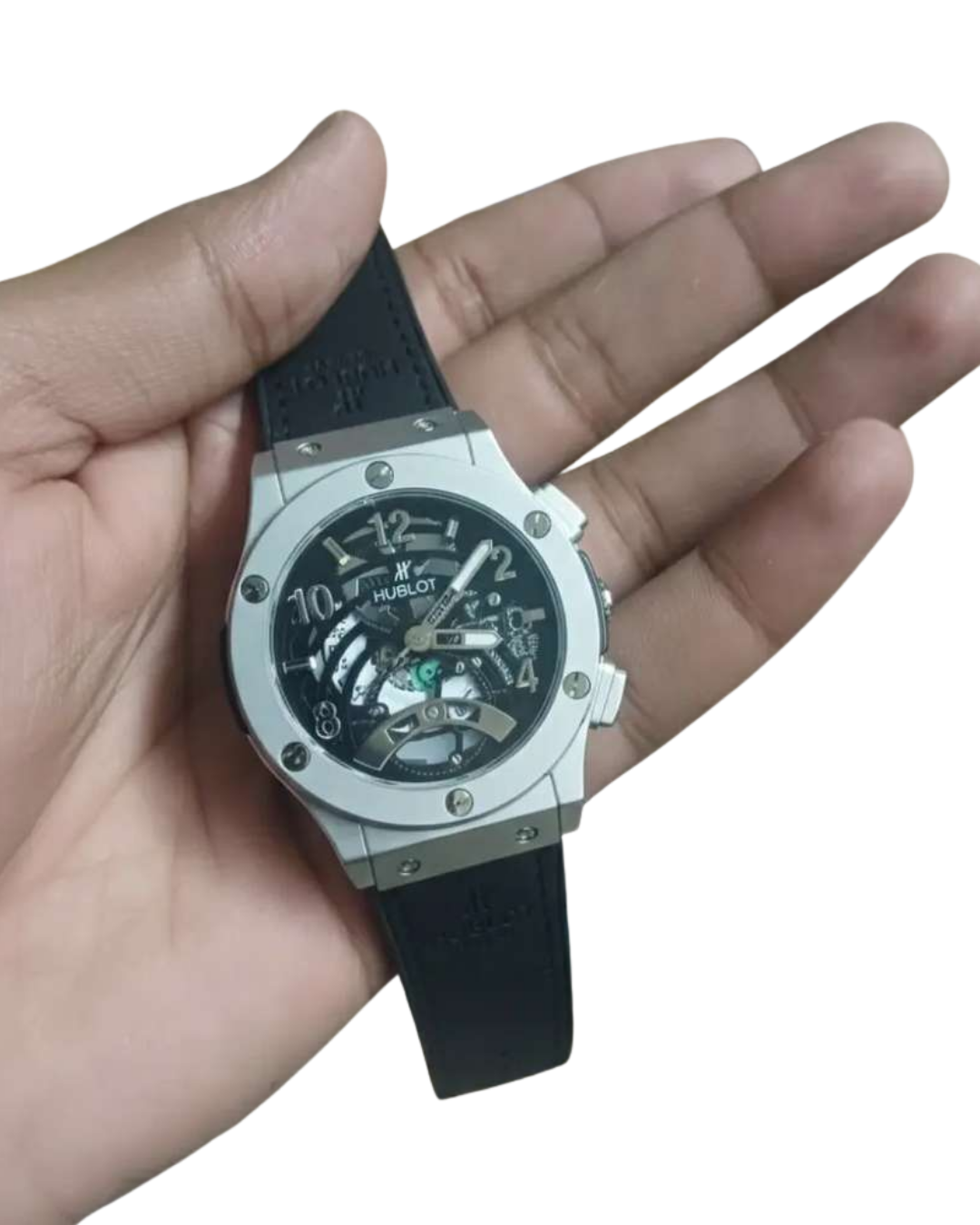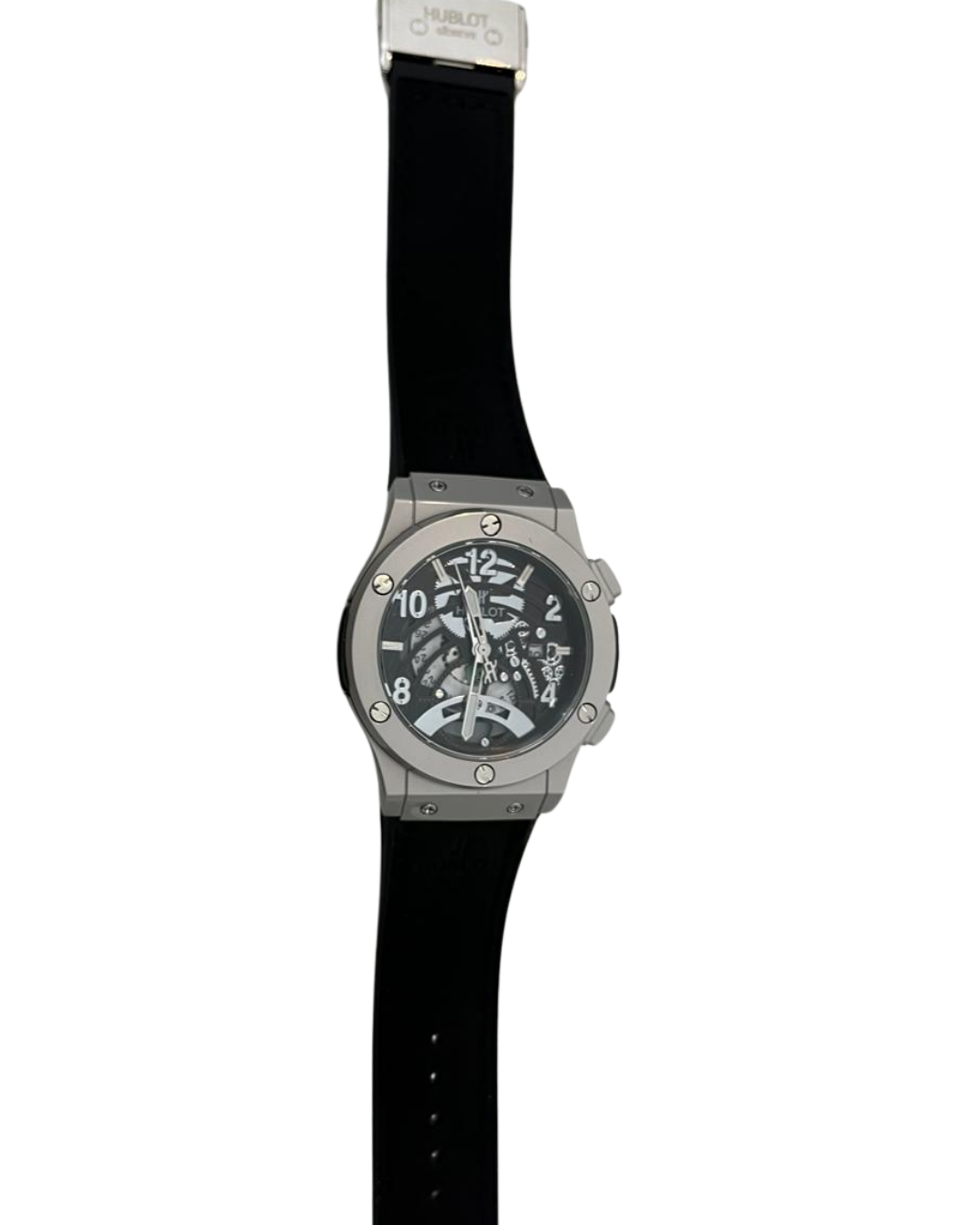 The case is crafted from high-grade stainless steel, giving it a polished premium finish with Hublot’s signature screw-studded bezel that enhances its sporty-luxury identity. The numerals and hands stand out sharply against the transparent dial, ensuring clarity and style in every glance.