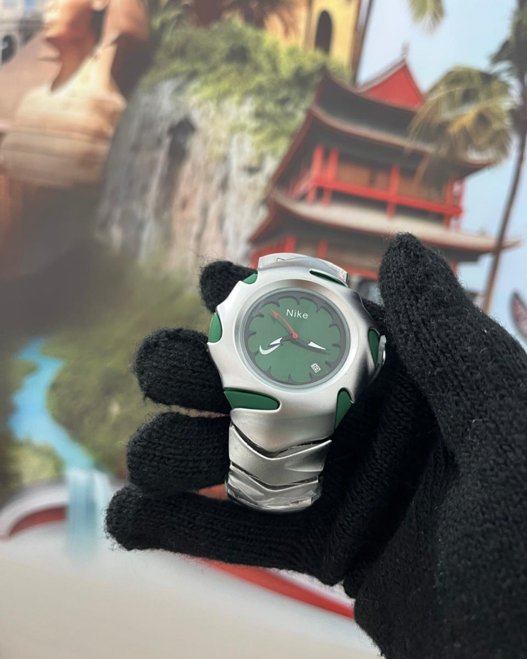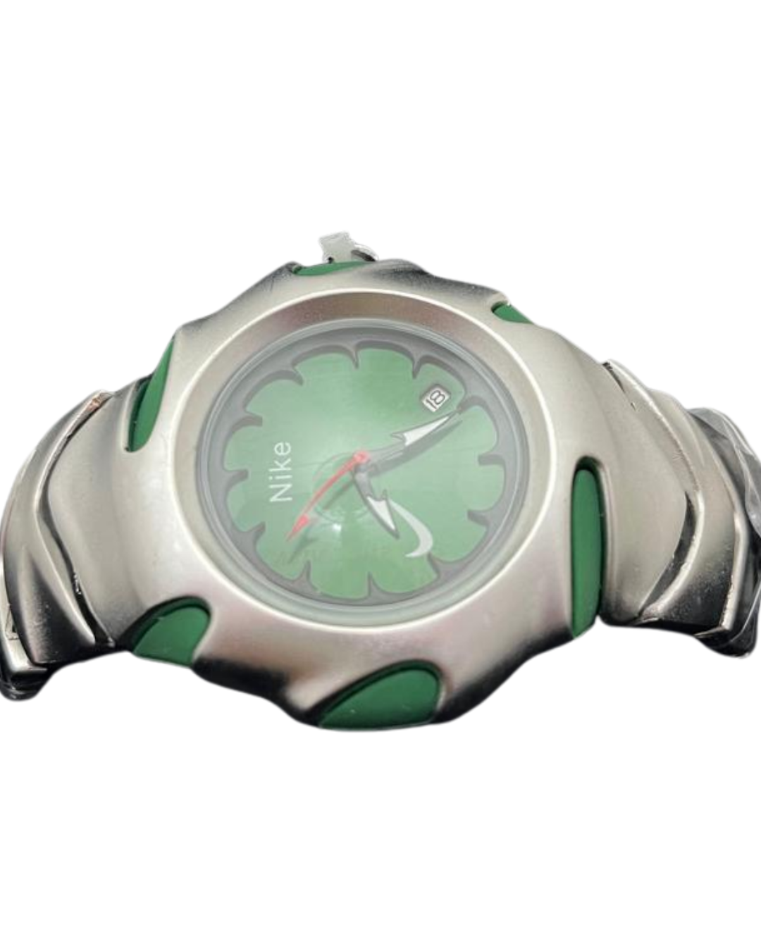 Featuring a distinctive green dial with an artistic carved pattern, the watch showcases Nike’s iconic sporty identity. The solid metallic case with green accents gives it a rugged yet stylish appeal, while the sculpted strap design offers a comfortable grip and long-lasting wear. The clear analog display includes a date window, ensuring practicality along with style.