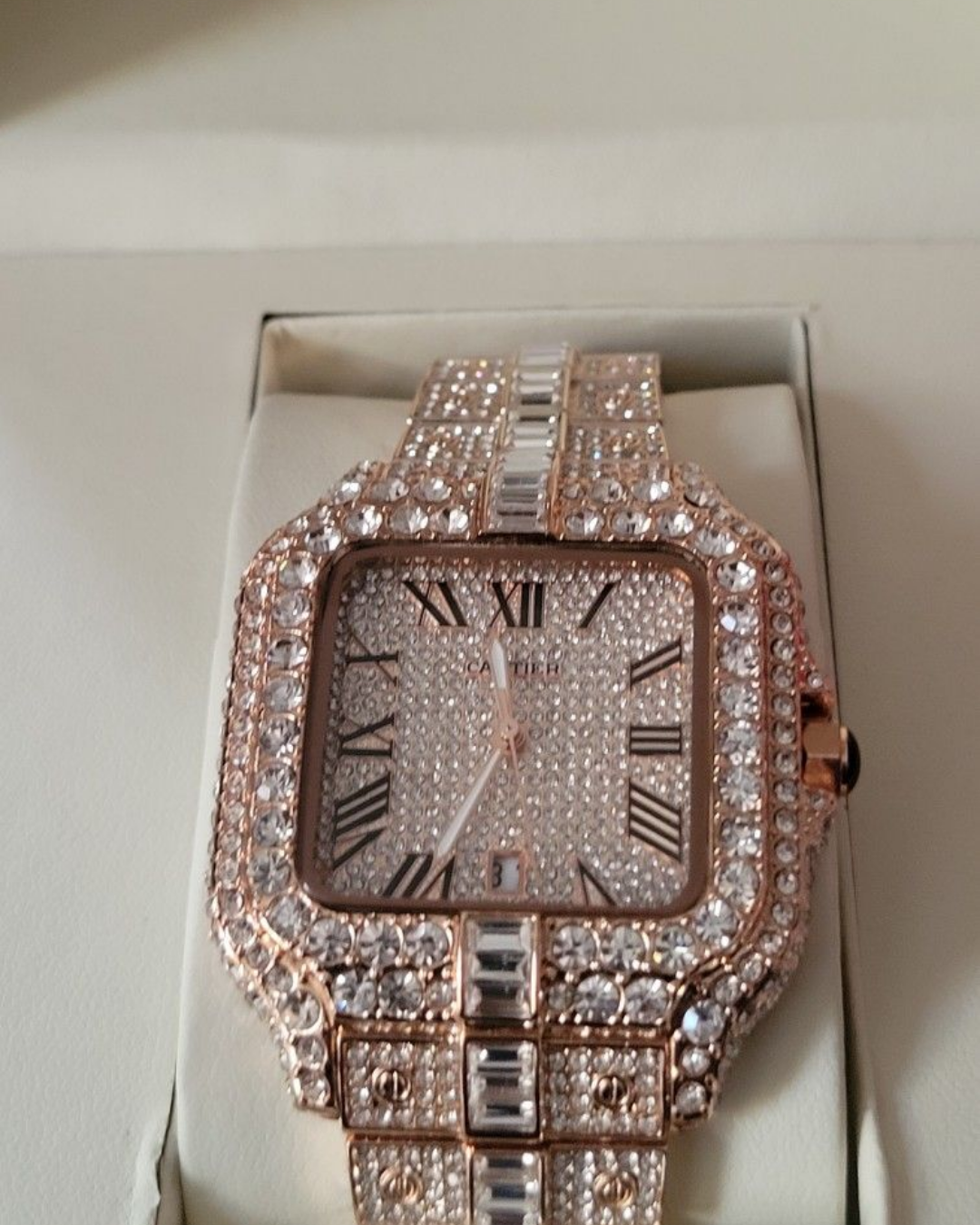 The square dial is covered in shimmering stones that reflect light from every angle, offering a breathtaking shine that elevates your entire look. The Roman numeral markers and sleek hands add a touch of classic sophistication, blending perfectly with the modern iced aesthetic.