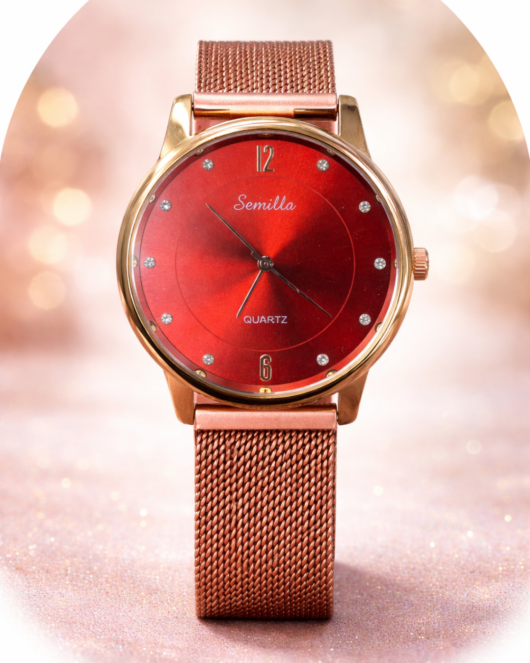 Introducing the Semilla Rose Luxe Ruby Dial Watch, a perfect blend of elegance and modern fashion crafted for those who appreciate style and sophistication. This premium timepiece features a stunning ruby-red sunburst dial that catches the light beautifully, making it an eye-catching accessory for every outfit.